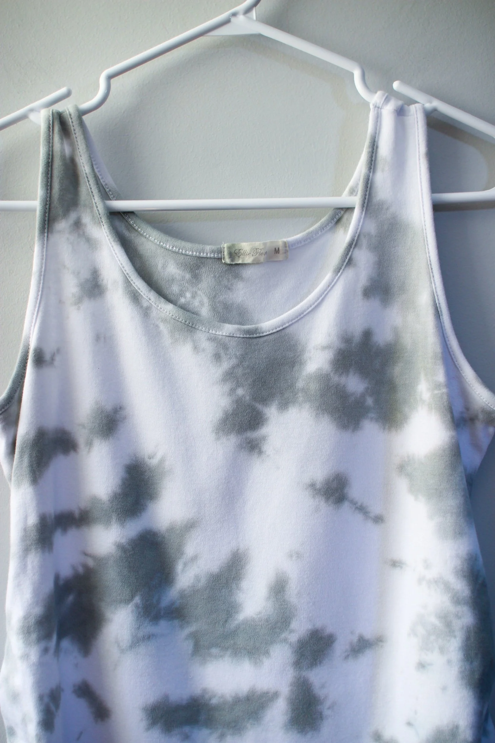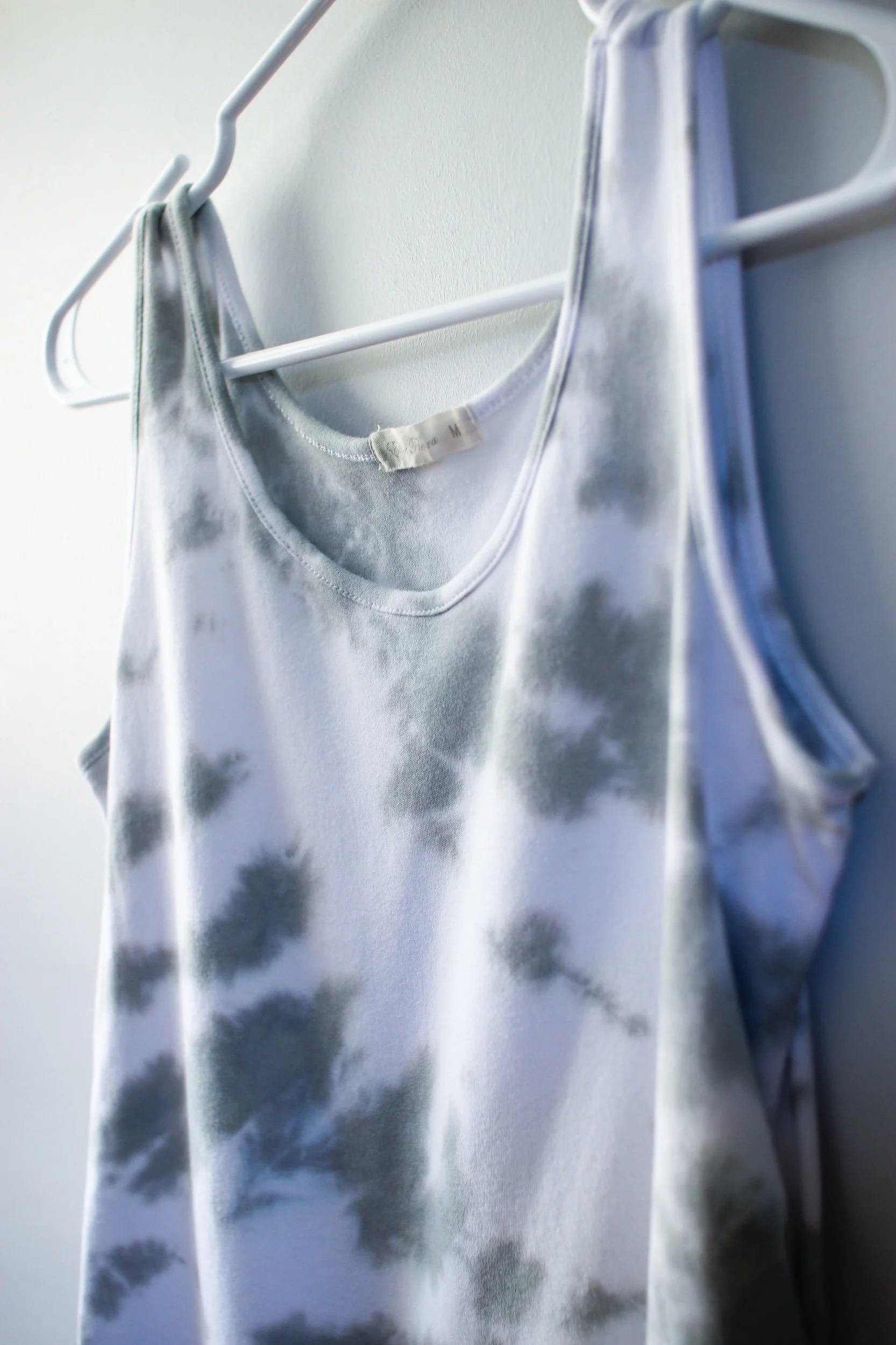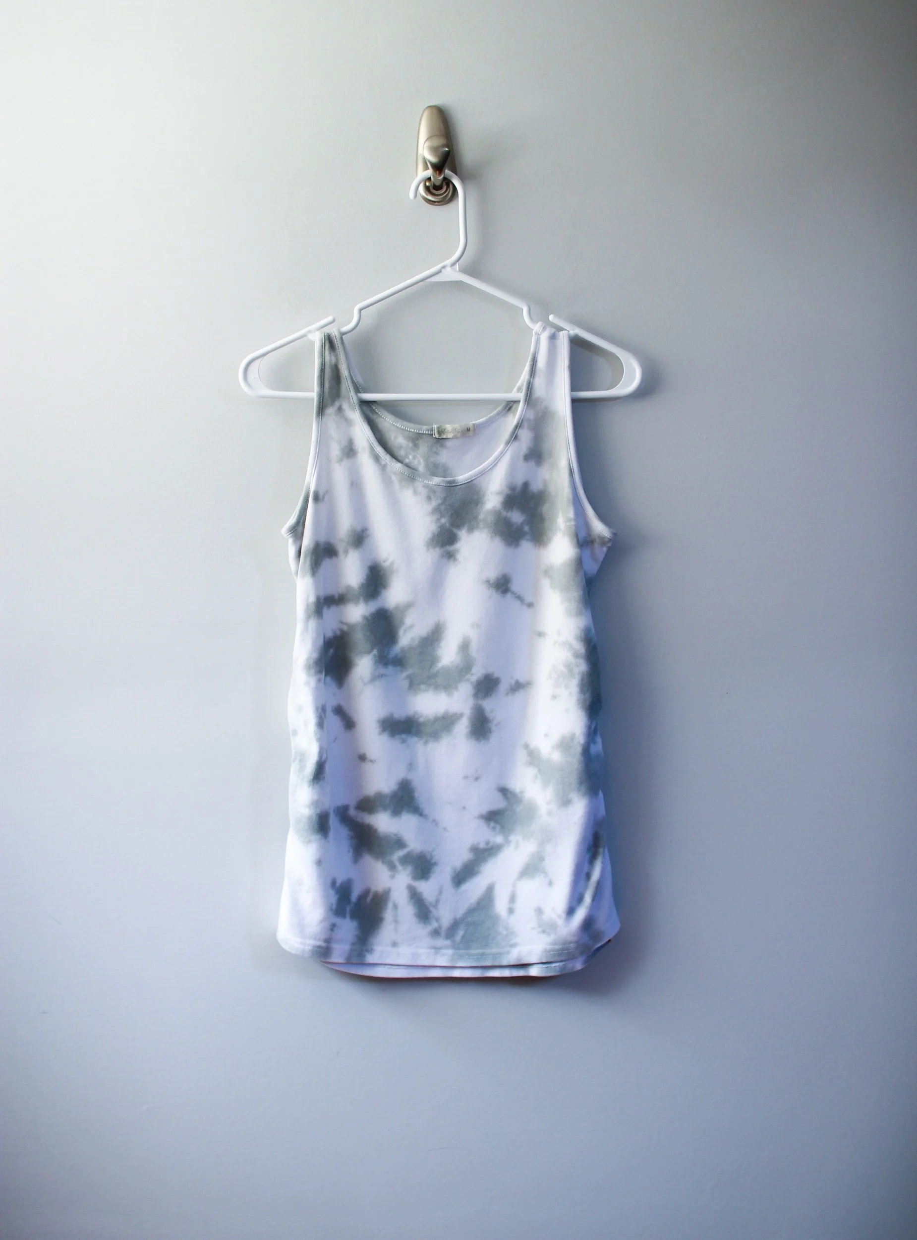 A simple pink and white tie-dye maternity tank top with ruching on the sides.