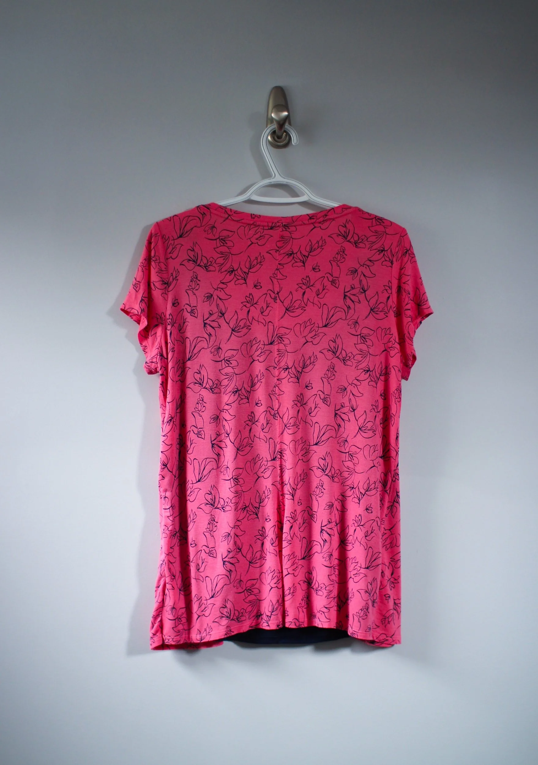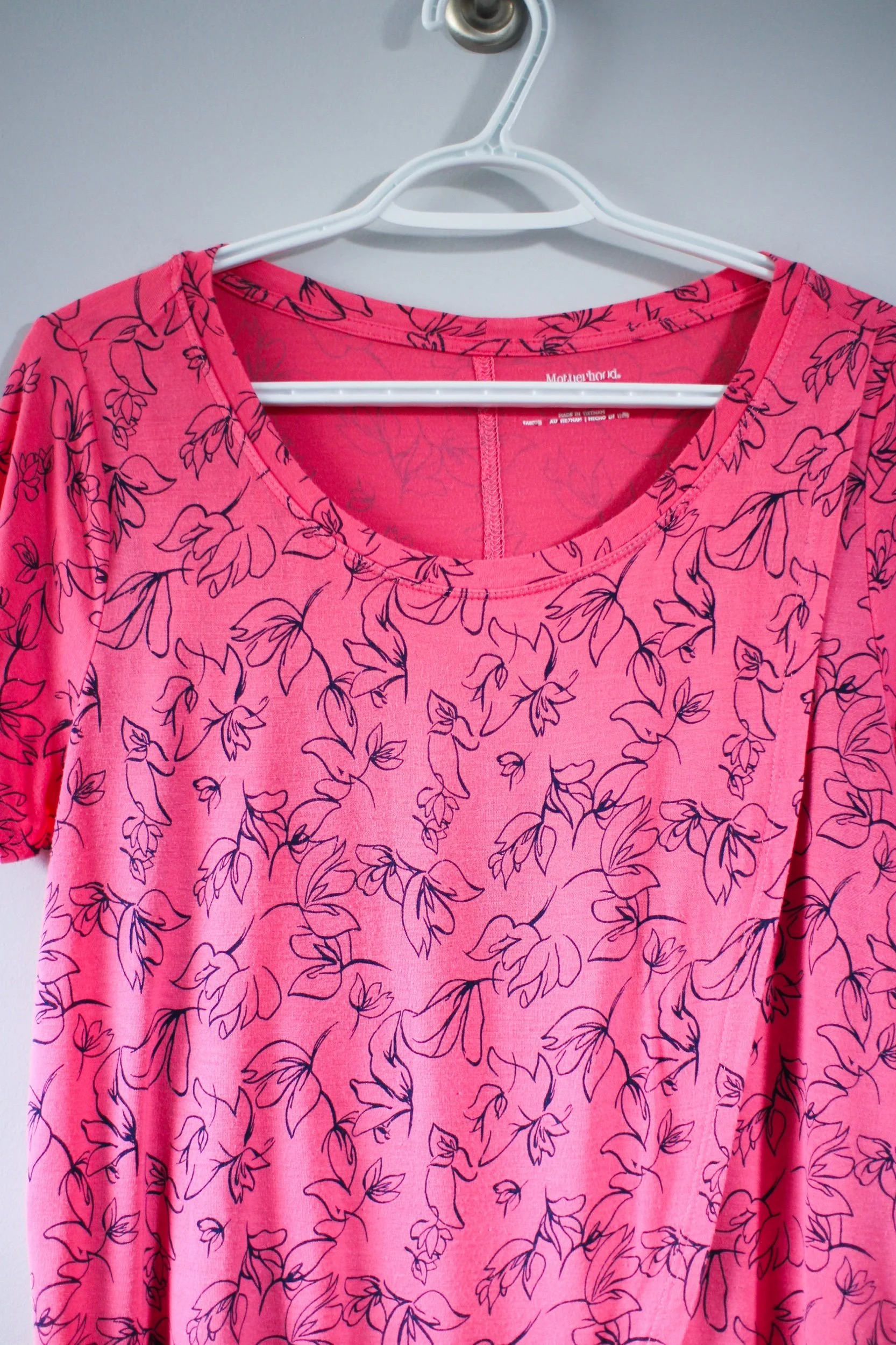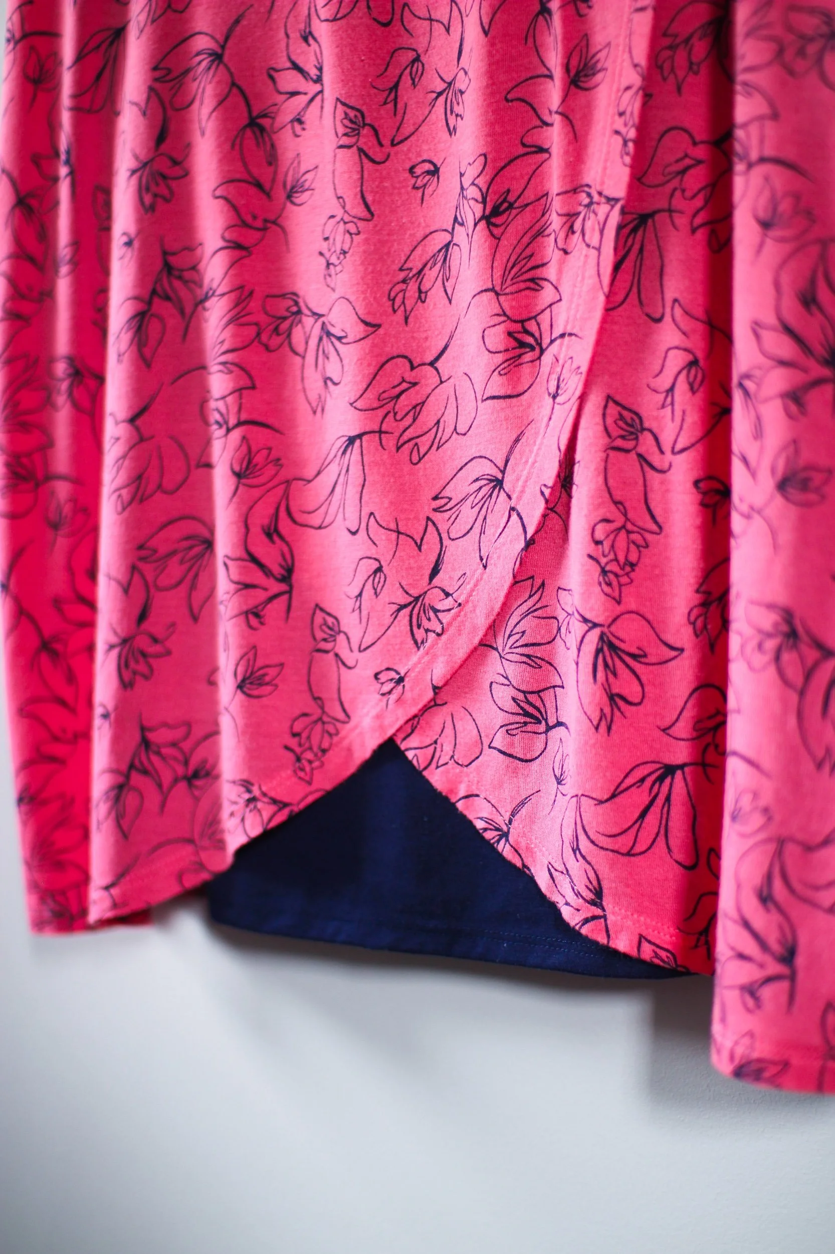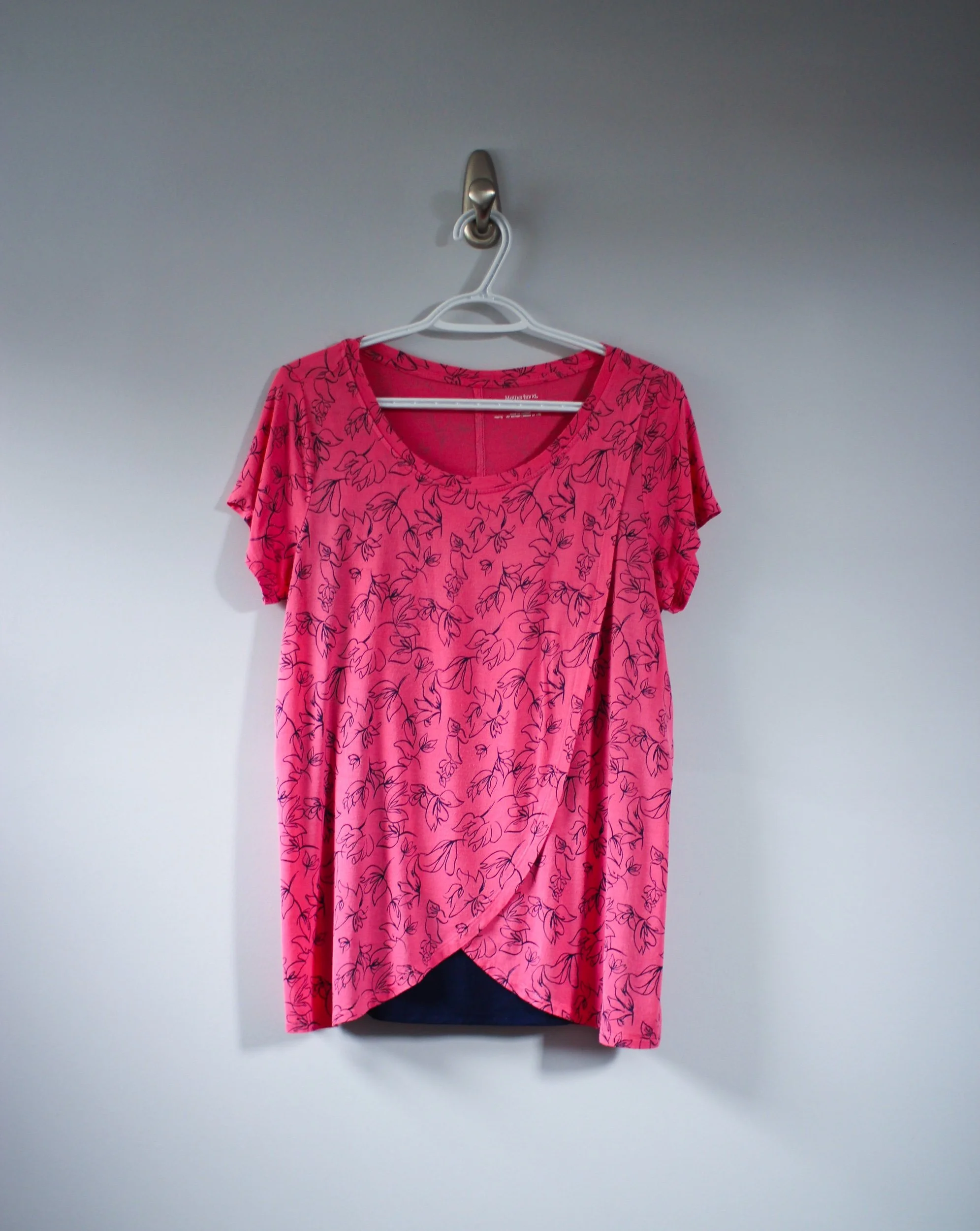 In a bright bold red, this faux wrap style top is not a maternity or nursing piece, but could easily work for both!