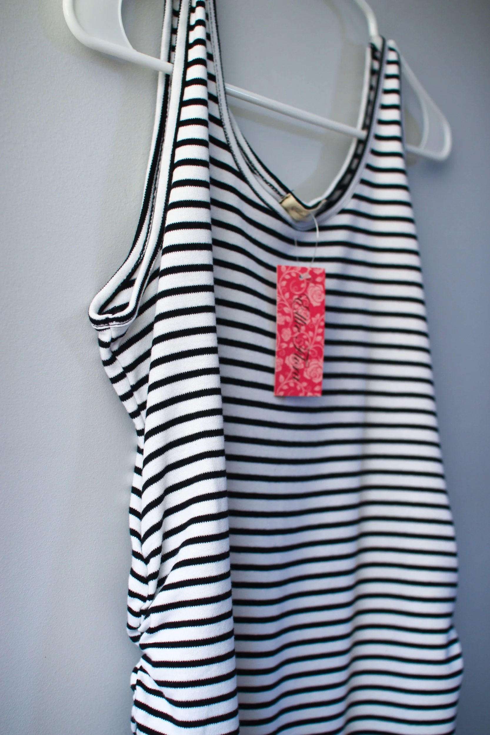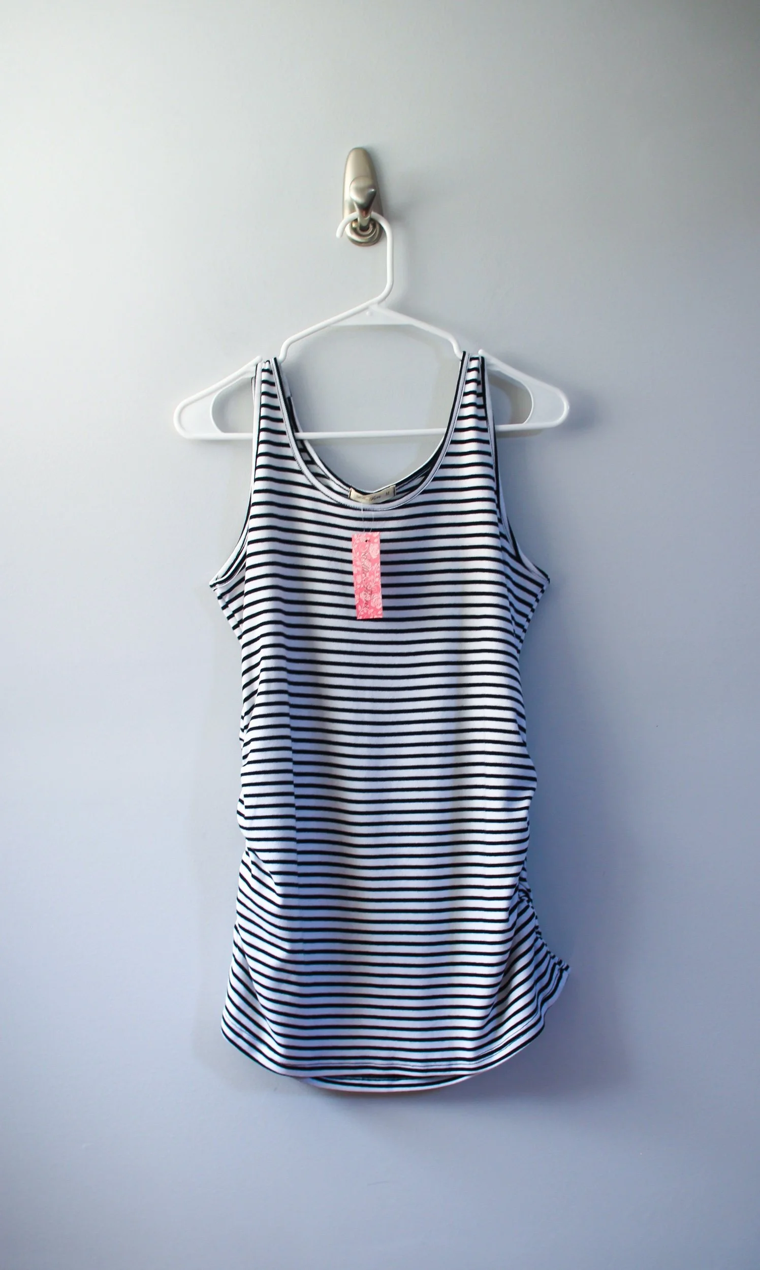 A simple white and black stripe maternity tank top with ruching on the sides.