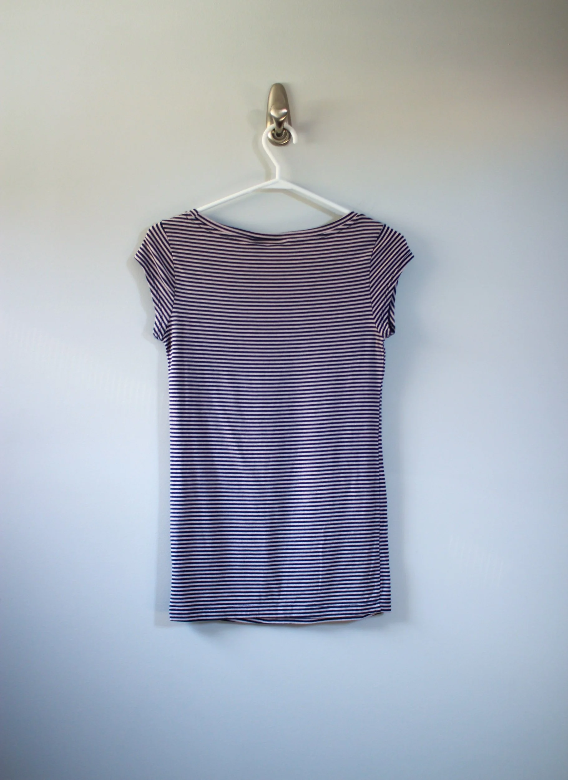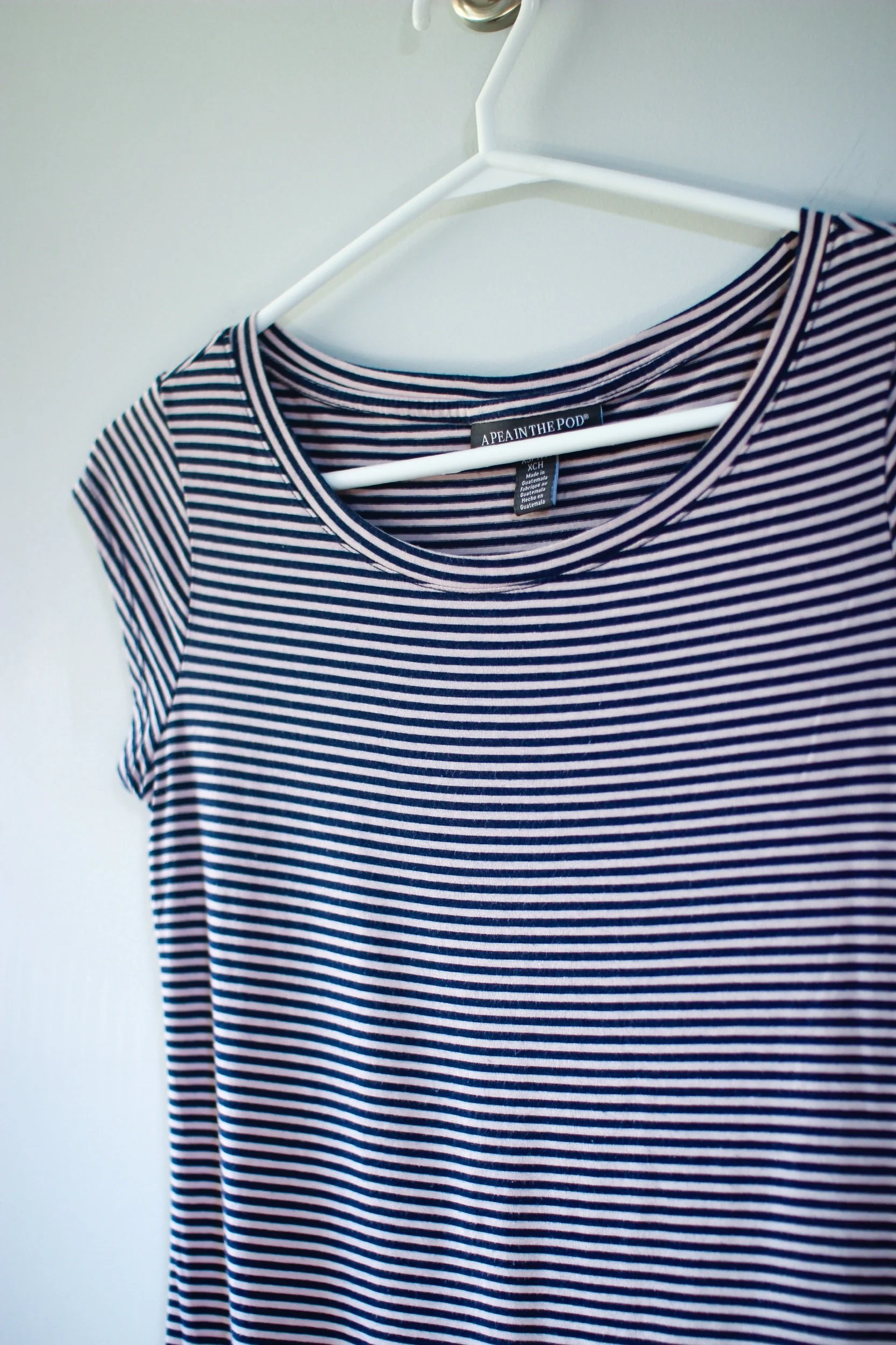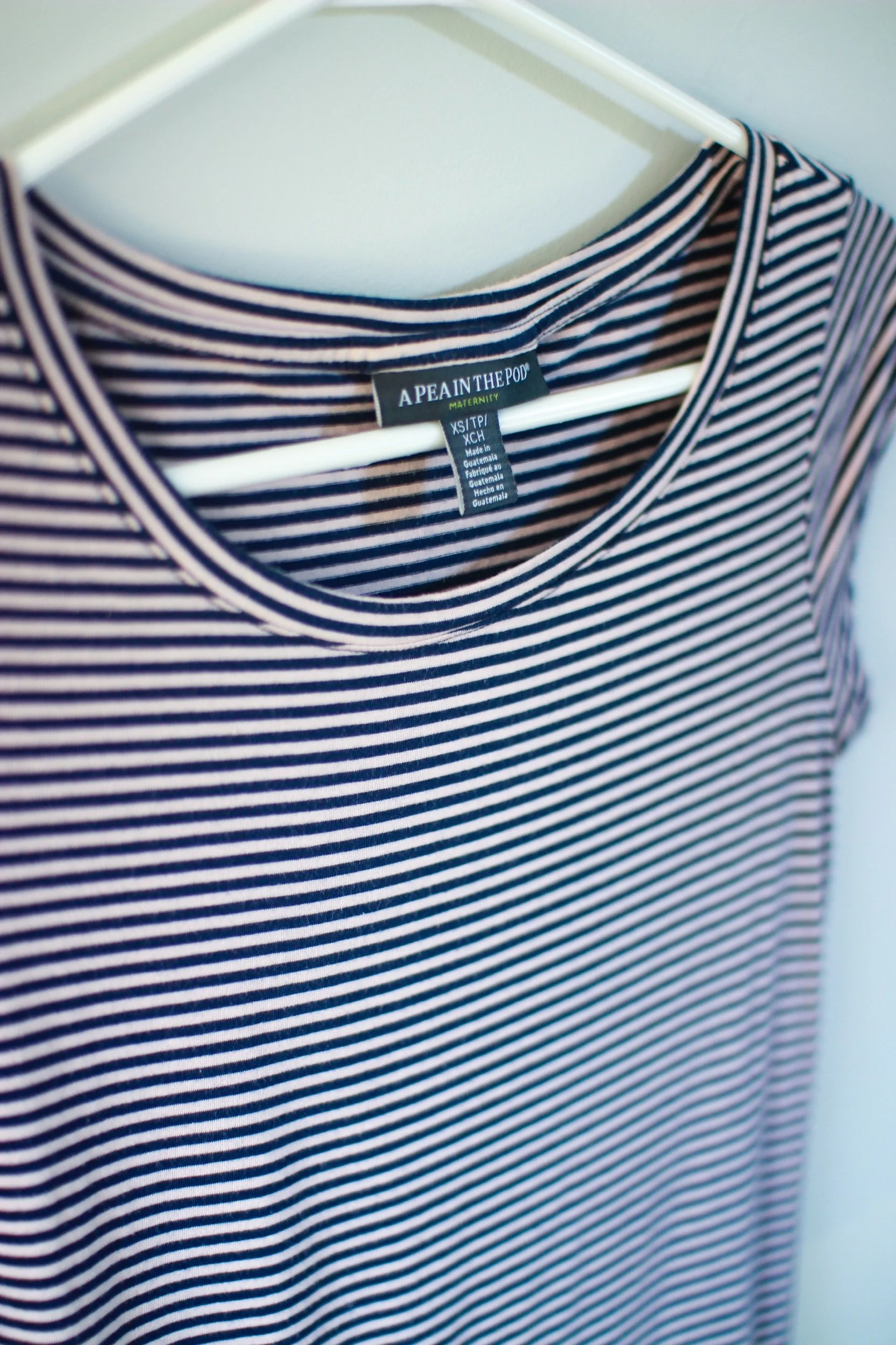 This purple T-shirt has fun pleated gathering at the base of your bump, allowing it to stretch as your body grows and making it suitable for casual postpartum wear as well.